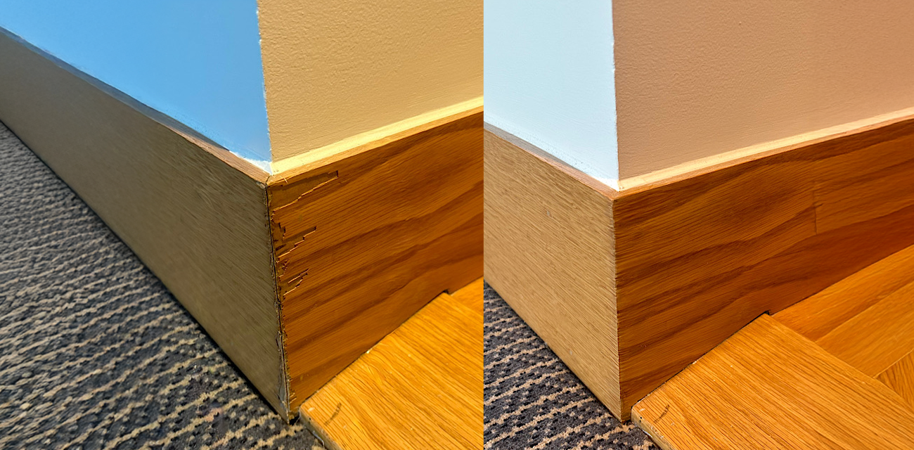 Transit damage, corner blows and chipped edges on veneers and laminates are micro-filled and re-profiled to sharp lines. Grain and tone are then recreated with tints and airbrushed blends before a protective topcoat. Subtle grain recreation ensures the repair reads as original material. The result is a seamless finish that preserves fittings and avoids costly replacement.